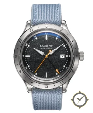 A GMT watch with a bold 43.5mm presence on the wrist, crafted from stainless steel featuring a black dial with a unique grained/pebble texture finish and a true GMT complication for tracking a second time zone.