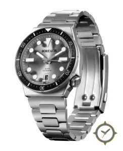 A Dive watch with a versatile 38.5mm case, that suits most wrists, crafted from stainless steel featuring a gray dial with a unique metallic finish.