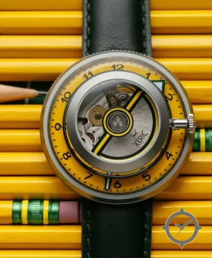 A Skeleton watch with a bold 53mm presence on the wrist, crafted from stainless steel featuring a yellow dial with a unique matte finish.