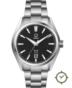 A Sports watch with a bold 45mm presence on the wrist, crafted from stainless steel featuring a black dial with a unique guilloche (subtle radial pattern) finish.
