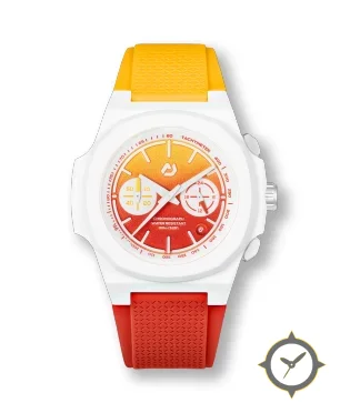 A Chronograph watch with a bold 46mm presence on the wrist, crafted from resin featuring a orange dial with a unique gradient sunburst finish.