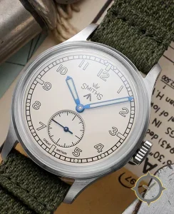 A Military watch with a vintage-inspired 34.5mm case, crafted from stainless steel featuring a black dial with a unique glossy finish.