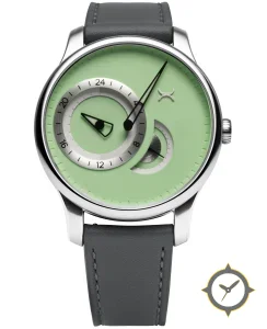 A Minimalist watch with a bold 45mm presence on the wrist, crafted from stainless steel featuring a green dial with a unique matte finish.