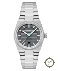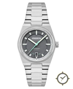 A Sports watch with a bold 44.5mm presence on the wrist, crafted from stainless steel featuring a gray dial with a unique horizontal ribbed grooves finish.