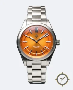 A Sports watch with a vintage-inspired 37.5mm case, crafted from stainless steel featuring a orange dial with a unique sunburst finish.