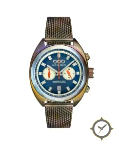 A Chronograph watch with a versatile 39mm case, that suits most wrists, crafted from bronze featuring a blue dial with a unique sunburst finish.