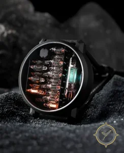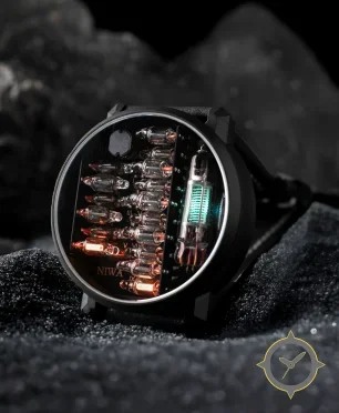 A Skeleton watch with a vintage-inspired 37mm case, crafted from stainless steel featuring a black dial with a unique exposed electronic components and Nixie-like tubes (open-worked, industrial) finish.