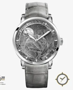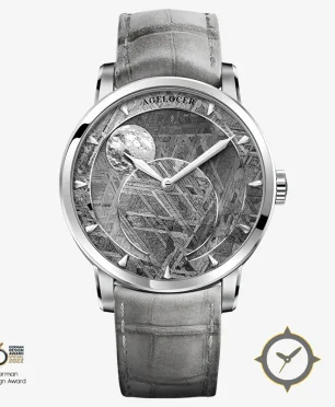 A Dress watch with a vintage-inspired 37.5mm case, crafted from stainless steel featuring a gray dial with a unique meteorite (Widmanstätten) texture, etched/criss-cross pattern finish and a beautiful moonphase display.