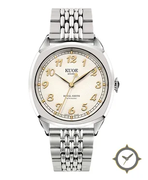 A Dress watch with a vintage-inspired 36mm case, crafted from stainless steel featuring a white dial with a unique subtle grained/eggshell texture finish.