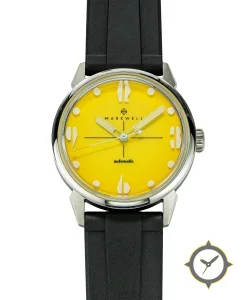 A Sports watch with a vintage-inspired 30mm case, crafted from stainless steel featuring a yellow dial with a unique glossy finish.