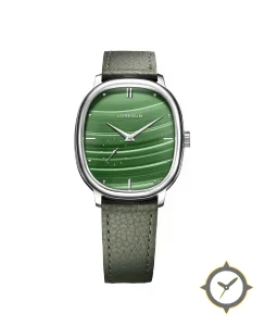 A Dress watch with a vintage-inspired 29mm case, crafted from stainless steel featuring a green dial with a unique malachite-style, wavy/striped stone grain finish.