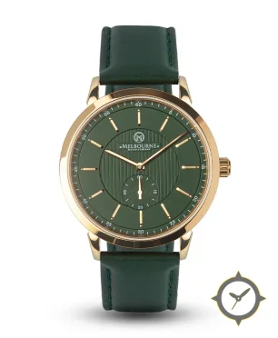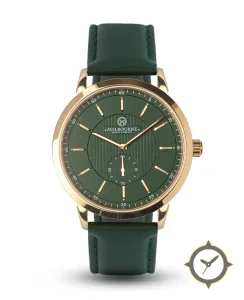 A Dress watch with a bold 47mm presence on the wrist, crafted from gold featuring a green dial with a unique vertical striped guilloché in center with matte outer ring finish.