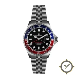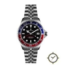 A GMT watch with a bold 42.5mm presence on the wrist, crafted from stainless steel featuring a black dial with a unique matte finish and a true GMT complication for tracking a second time zone.