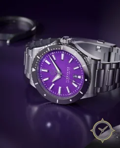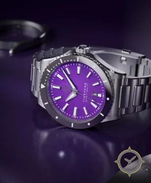 A Dive watch with a bold 42mm presence on the wrist, crafted from stainless steel featuring a purple dial with a unique textured / slightly marbled finish finish.