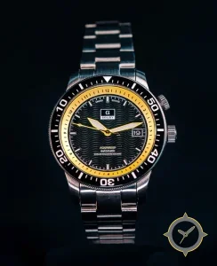 A Dive watch with a bold 44.5mm presence on the wrist, crafted from stainless steel featuring a black dial with a unique wavy / guilloché finish.