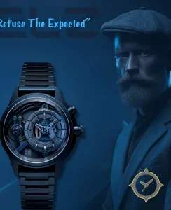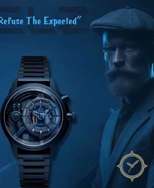 A Skeleton watch with a bold 52mm presence on the wrist, crafted from stainless steel featuring a black dial with a unique multi-layer skeletonized/exposed movement with matte metallic surfaces finish and a helpful power reserve indicator.