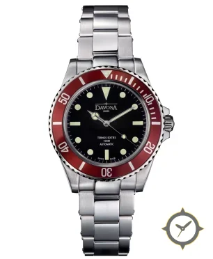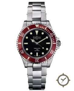 A Dive watch with a vintage-inspired 33mm case, crafted from stainless steel featuring a black dial with a unique glossy finish.