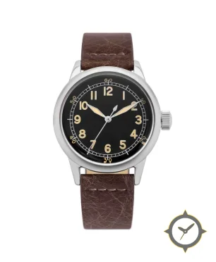 A Field watch, crafted from stainless steel featuring a black dial with a unique matte finish.