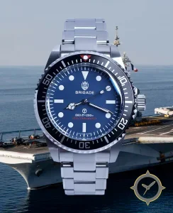 A Dive watch with a vintage-inspired 34mm case, crafted from stainless steel featuring a blue dial with a unique matte finish.