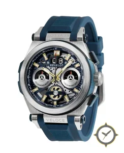 A Chronograph watch with a bold 47mm presence on the wrist, crafted from stainless steel featuring a navy dial with a unique skeletonized with layered mechanical details finish.
