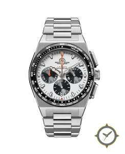 A Chronograph watch with a versatile 38mm case, that suits most wrists, crafted from stainless steel featuring a white dial with a unique matte/grained texture finish.