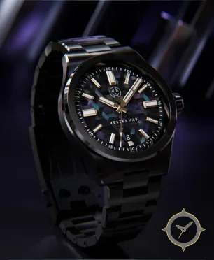 A Sports watch with a bold 46mm presence on the wrist, crafted from stainless steel featuring a black dial with a unique iridescent geometric 3D hexagonal mosaic finish.