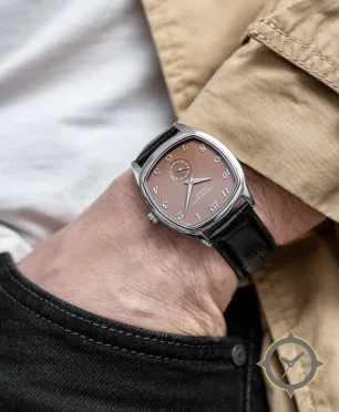 A Dress watch with a vintage-inspired 32mm case, crafted from stainless steel featuring a brown dial with a unique grained / frosted metallic finish.