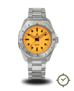 A Dive watch with a bold 47.5mm presence on the wrist, crafted from stainless steel featuring a orange dial with a unique matte finish.