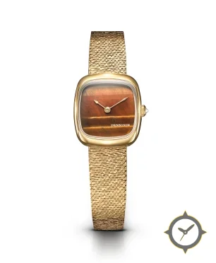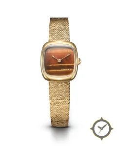 A Dress watch with a versatile 40mm case, that suits most wrists, crafted from gold featuring a brown dial with a unique tiger's eye stone (chatoyant) finish.