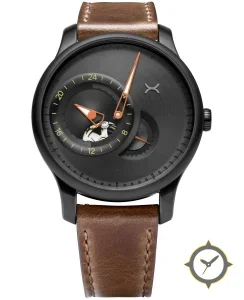 A watch with a vintage-inspired 35.5mm case, crafted from stainless steel featuring a black dial with a unique radial brushed finish finish.