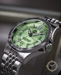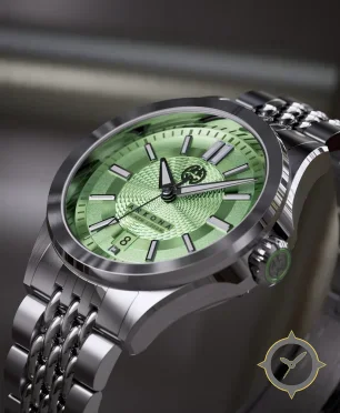 A Luxury watch with a vintage-inspired 36.5mm case, crafted from stainless steel featuring a green dial with a unique concentric guilloche / engine‑turned texture finish.