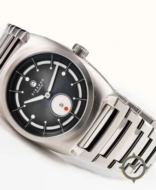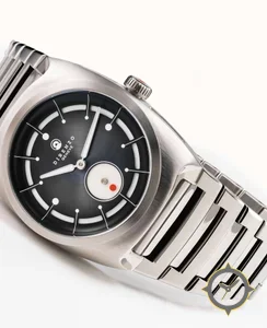 A Minimalist watch with a vintage-inspired 34.5mm case, crafted from stainless steel featuring a black dial with a unique sunburst finish.