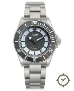 A Dive watch with a vintage-inspired 37mm case, crafted from stainless steel featuring a black dial with a unique matte center with brushed concentric ring finish.