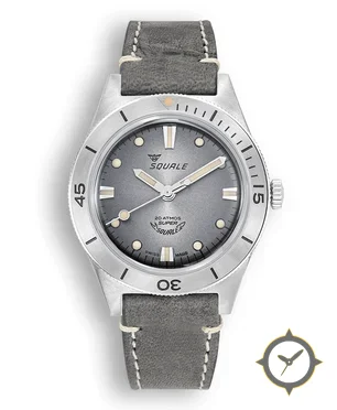 A Dive watch with a vintage-inspired 33mm case, crafted from stainless steel featuring a gray dial with a unique fumé gradient (subtle sunburst effect) finish.