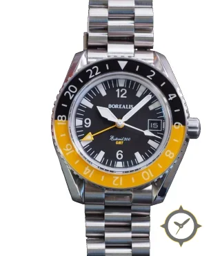 A GMT watch with a versatile 39.5mm case, that suits most wrists, crafted from stainless steel featuring a black dial with a unique matte finish and a true GMT complication for tracking a second time zone.