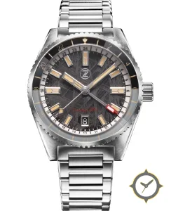 A GMT watch with a vintage-inspired 34.5mm case, crafted from stainless steel featuring a gray dial with a unique Widmanstätten / meteorite texture (cross-hatched) finish and a true GMT complication for tracking a second time zone.