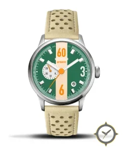 A Racing watch with a vintage-inspired 36mm case, crafted from stainless steel featuring a green dial with a unique lacquer finish.