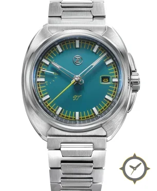 A Sports watch with a bold 44.5mm presence on the wrist, crafted from stainless steel featuring a turquoise dial with a unique matte lacquer finish and a helpful power reserve indicator.