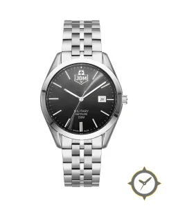 A Military watch with a bold 46mm presence on the wrist, crafted from stainless steel featuring a black dial with a unique sunburst finish.