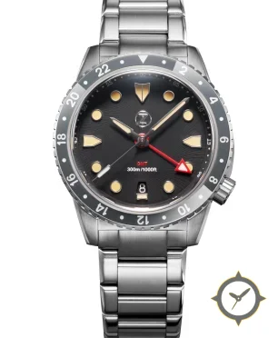 A GMT watch with a versatile 39mm case, that suits most wrists, crafted from stainless steel featuring a black dial with a unique sunburst / sunray finish finish and a true GMT complication for tracking a second time zone.