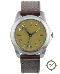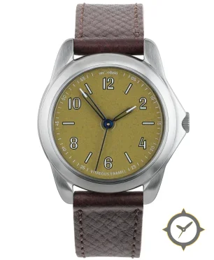A Field watch with a bold 42.5mm presence on the wrist, crafted from stainless steel featuring a yellow dial with a unique vitreous enamel, slightly speckled finish.