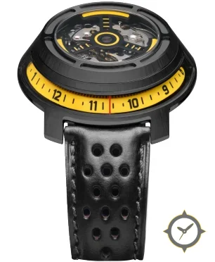 A Skeleton watch with a bold 43.5mm presence on the wrist, crafted from stainless steel featuring a yellow dial with a unique skeleton/open-work finish.