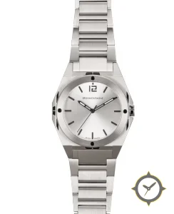 A Luxury watch with a bold 46mm presence on the wrist, crafted from stainless steel featuring a silver dial with a unique sunburst / brushed finish.