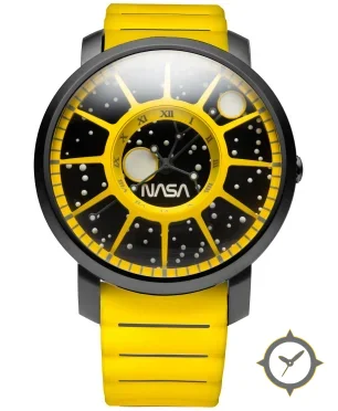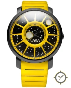 A Sports watch with a bold 44.5mm presence on the wrist, crafted from stainless steel featuring a black dial with a unique glossy finish and a beautiful moonphase display.