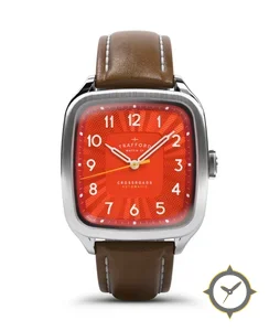 A Vintage watch with a vintage-inspired 32mm case, crafted from stainless steel featuring a red dial with a unique textured guilloche / radiating geometric pattern finish.