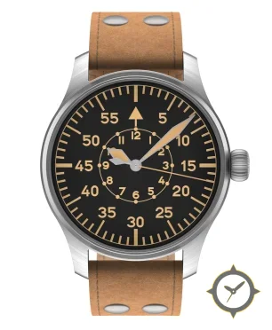 A Pilot watch with a bold 43mm presence on the wrist, crafted from stainless steel featuring a black dial with a unique matte finish.