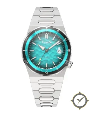 A Dive watch with a bold 45mm presence on the wrist, crafted from stainless steel featuring a turquoise dial with a unique wavy/relief (wave texture) finish.