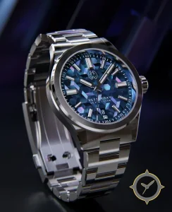 A Sports watch with a bold 47mm presence on the wrist, crafted from stainless steel featuring a blue dial with a unique three-dimensional geometric tessellated/cubic texture with iridescent finish finish.