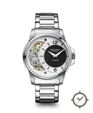 A Skeleton watch with a bold 44mm presence on the wrist, crafted from stainless steel featuring a white dial with a unique wavy/guilloche texture finish.