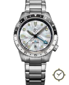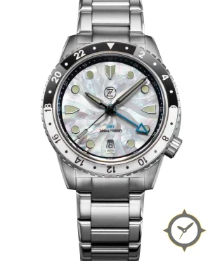 A GMT watch with a bold 43.5mm presence on the wrist, crafted from stainless steel featuring a white dial with a unique mother-of-pearl (iridescent) finish and a true GMT complication for tracking a second time zone.